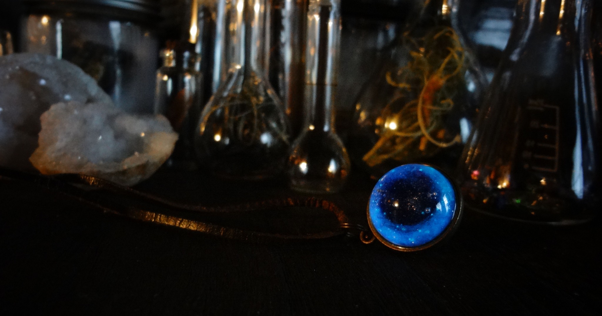 先日、当製作所の蓄光作品(オールト雲疑似標本)を身に付けて5分程屋外を歩いた後、薄暗い場所でふと作品に目を落とすと……