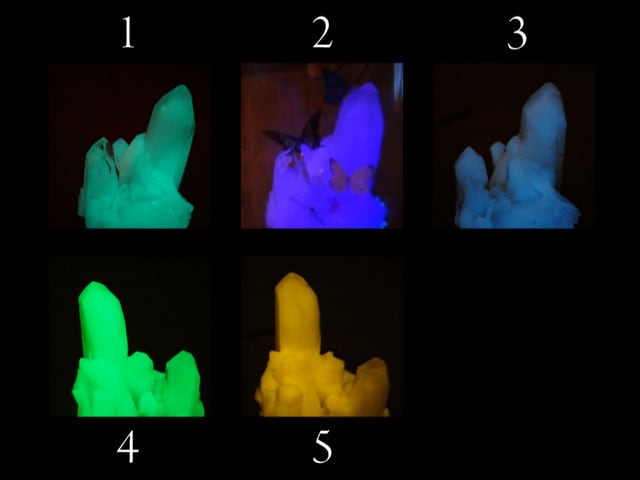 ◆明るい場所で光らせた場合は、蓄光後暗闇で光る色が現れます。