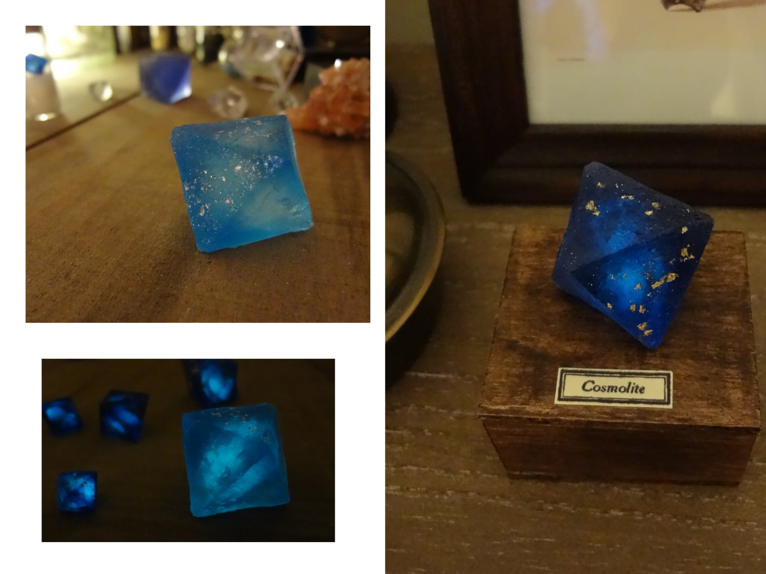 内部の銀や金、碧色のインクルージョンは昼光下で星空のように煌めく。