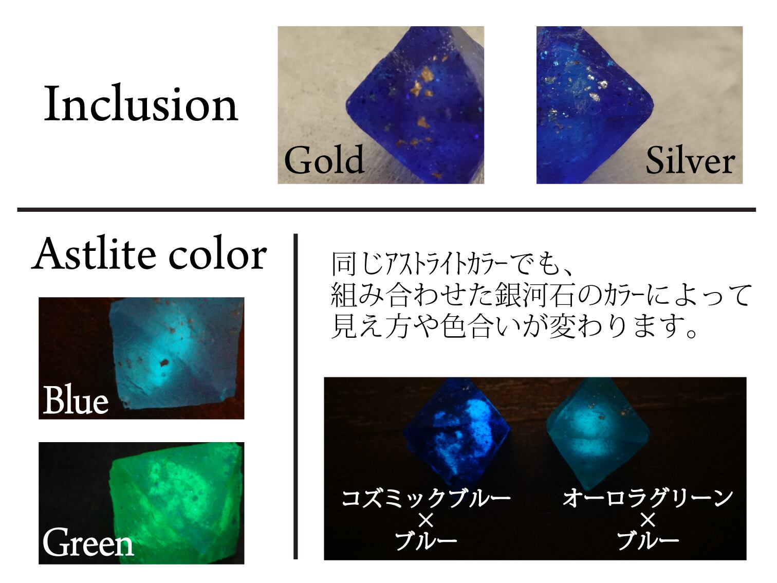 アストライトは細かい為瞬かないが、暗闇であれば鉱石内で光を放ち、銀河を閉じ込めた石のように見える事からこの名が付いた。