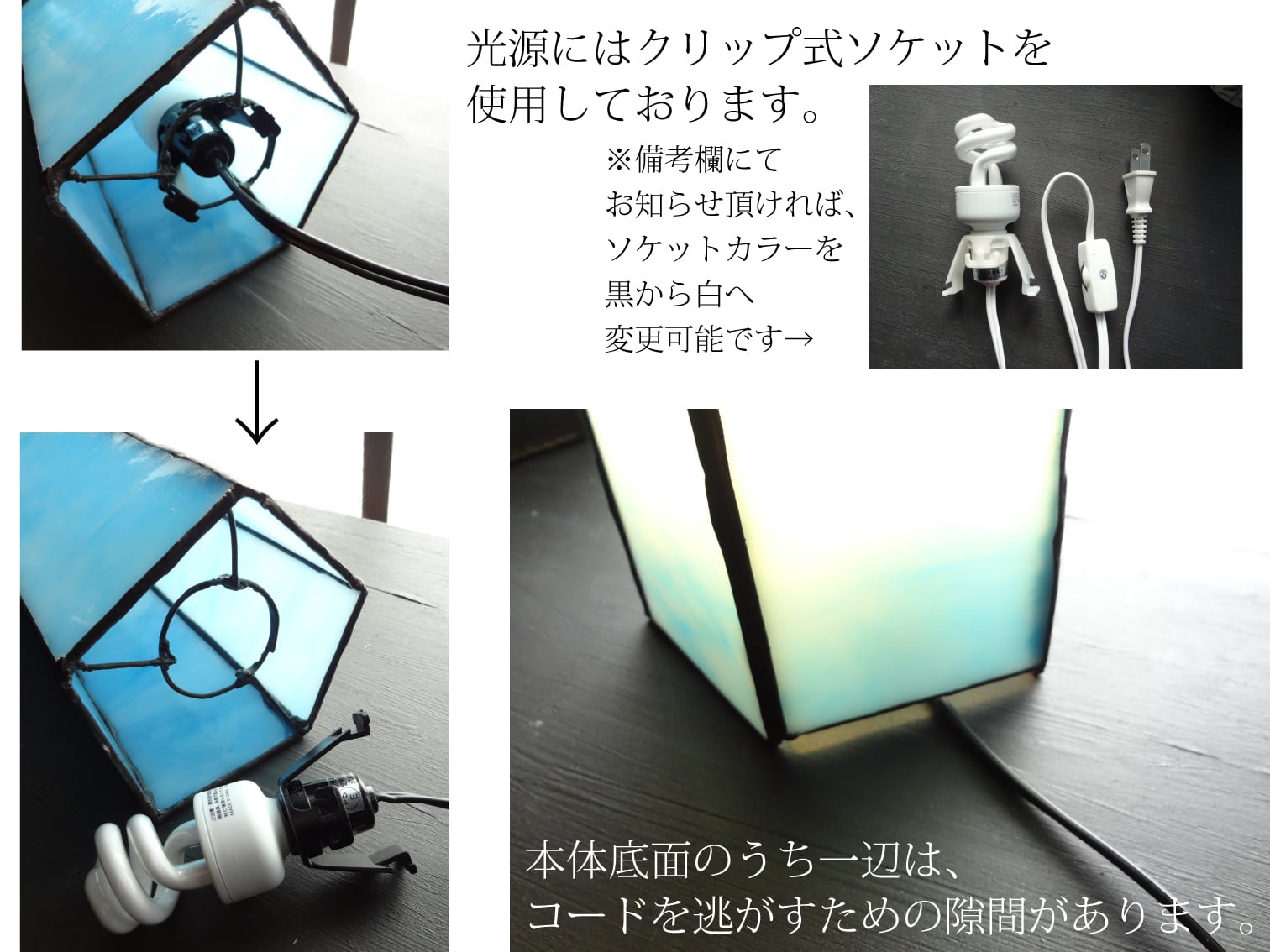 ※ソケットには40Wまでの電球が使用可能ですが、熱が籠りやすい形状の為、電球型蛍光灯(熱が発生しにくい)または25wの白熱球をご使用下さい。