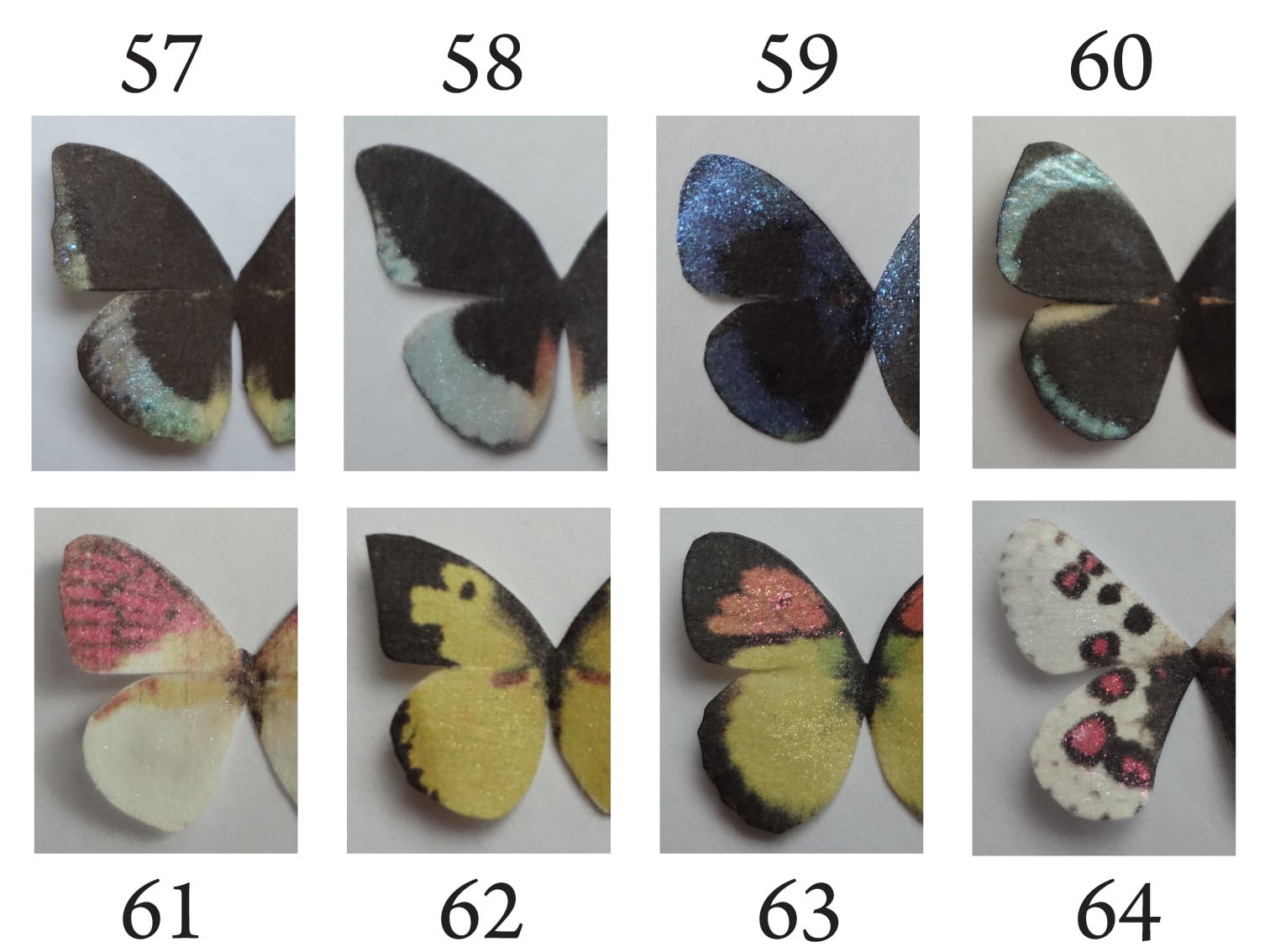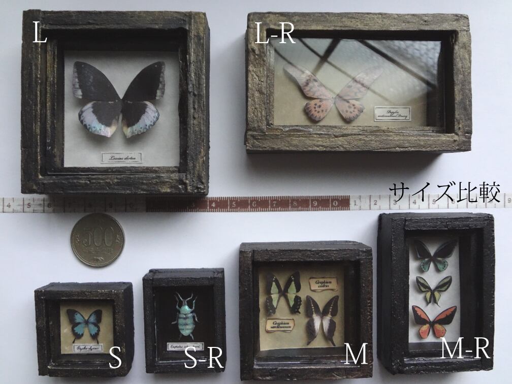 ご選択頂く為の写真(8~19)では分かりづらいですが、標本本体は本物の蝶などのように角度によって輝きます(2枚目の写真をご参照下さい)。
