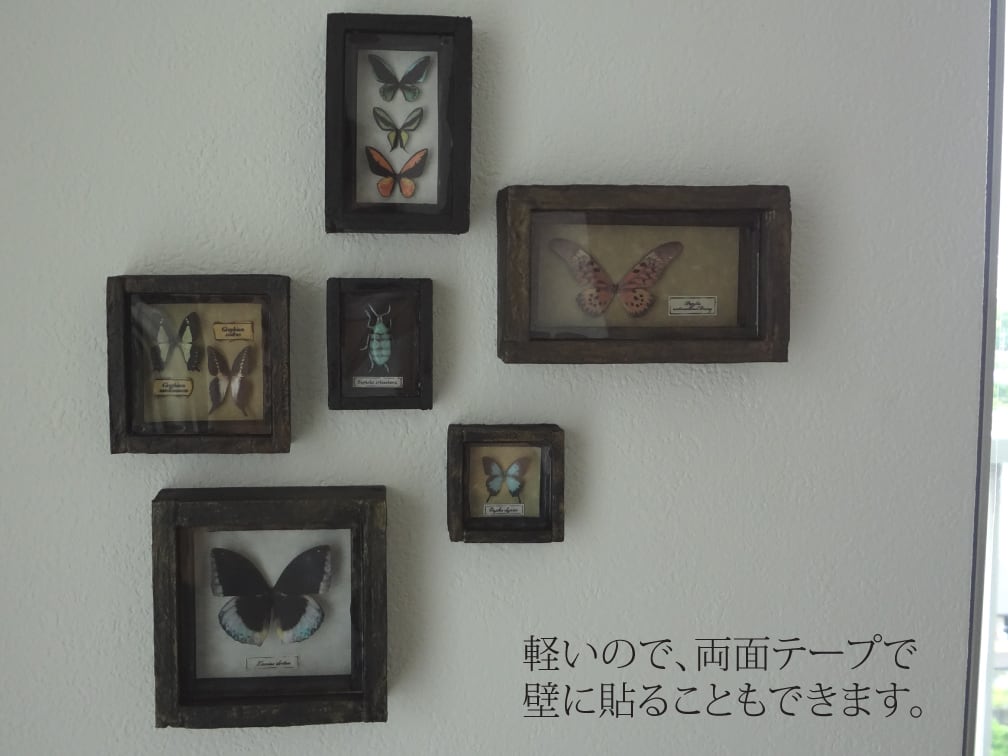 ご選択頂く為の写真(8~19)では分かりづらいですが、標本本体は本物の蝶などのように角度によって輝きます(2枚目の写真をご参照下さい)。
