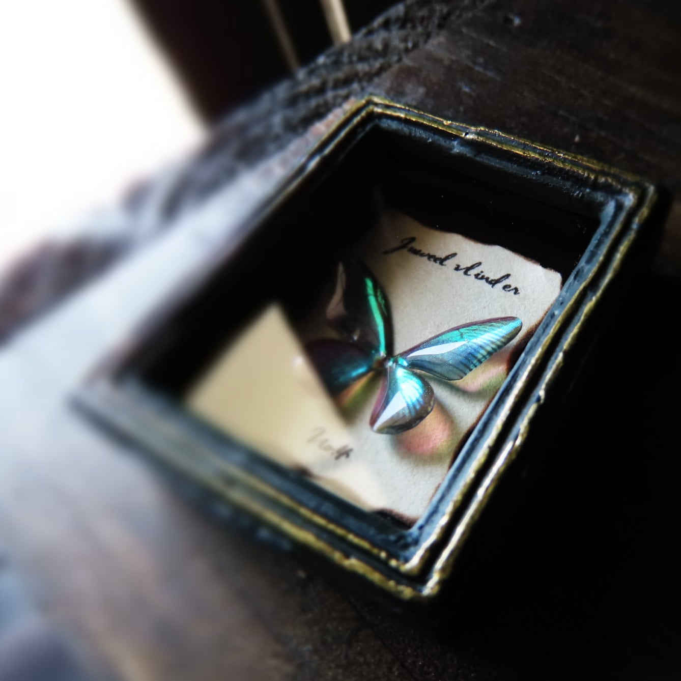 ■蝶に光が当たると、角度によってライトブルーの耀きを放ちます。