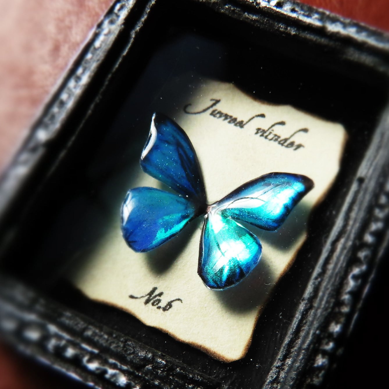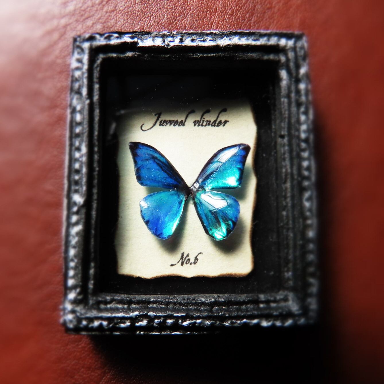 ■蝶に光が当たると、角度によってスカイブルーの耀きを放ちます。